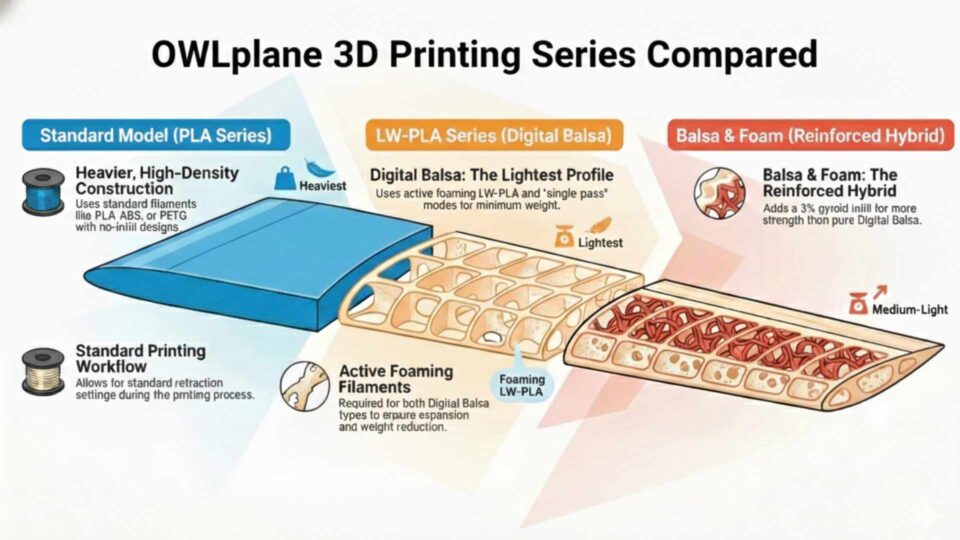 - ideaMaker, Cura and S3D OWLplane Profile files for 0.3mm and 0.4mm Nozzles for PLA model series, both DD and Bowden type printers. For LW-PLA/ “Digital Balsa and Foam” series, both nozzle sizes (0.3mm and/or 0.4mm) and Direct Drive or Bowden type of printers use the same Profile files due to LW-PLA filament specific characteristic when printing. For “Digital Balsa and Foam” series, S3D is replaced with PrusaSlicer slicers due to that there is no gyroid infill patterns. In 2025 onward, They are simplified by utilizing OrcaSlicer (just update the Profile or select the correct Profile to print).