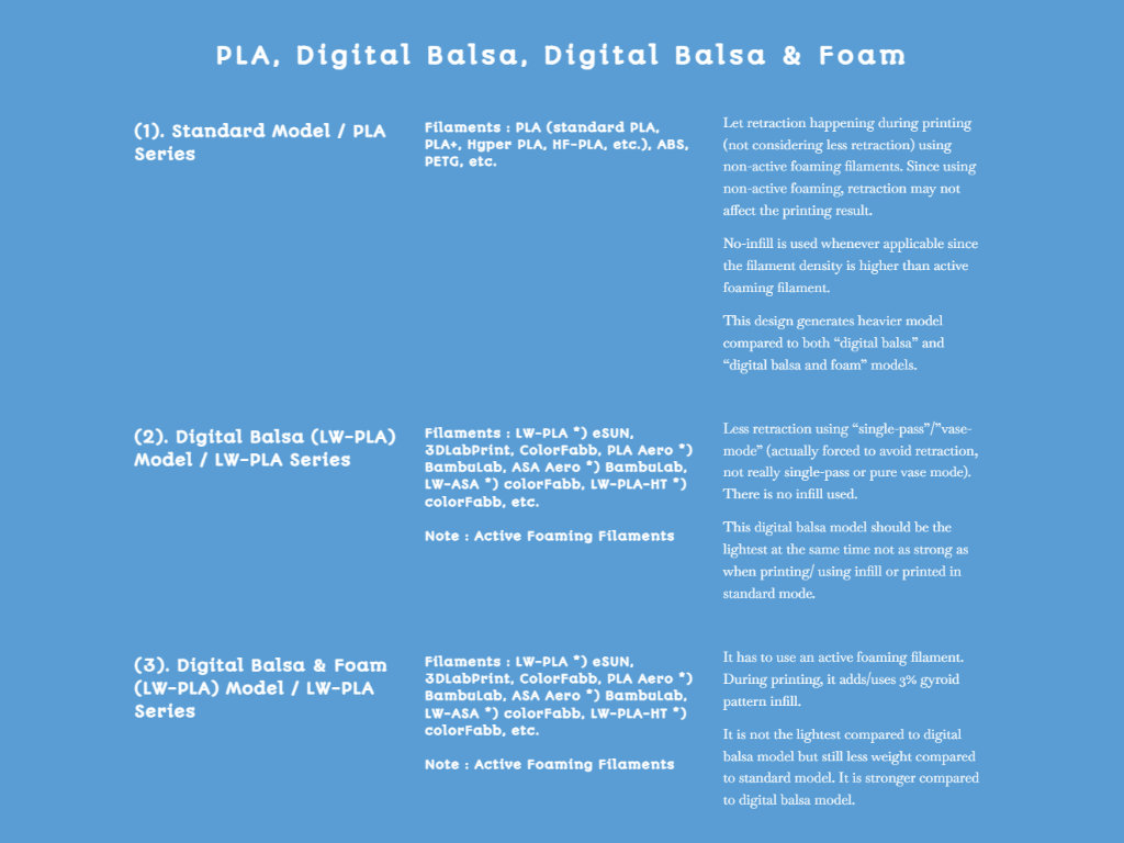 ~ 3 Variants : (a). "PLA", (b). "LW-PLA Digital Balsa" and (c). "Both LW-PLA Digital Balsa and Foam" Series ~