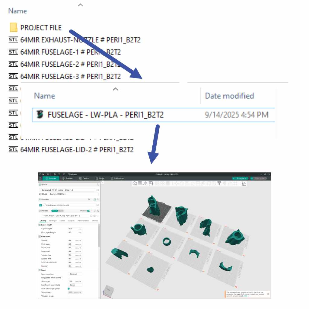 Open the project file with orca slicer. It will find fuselage stl files as depicted on the right side screenshoot.