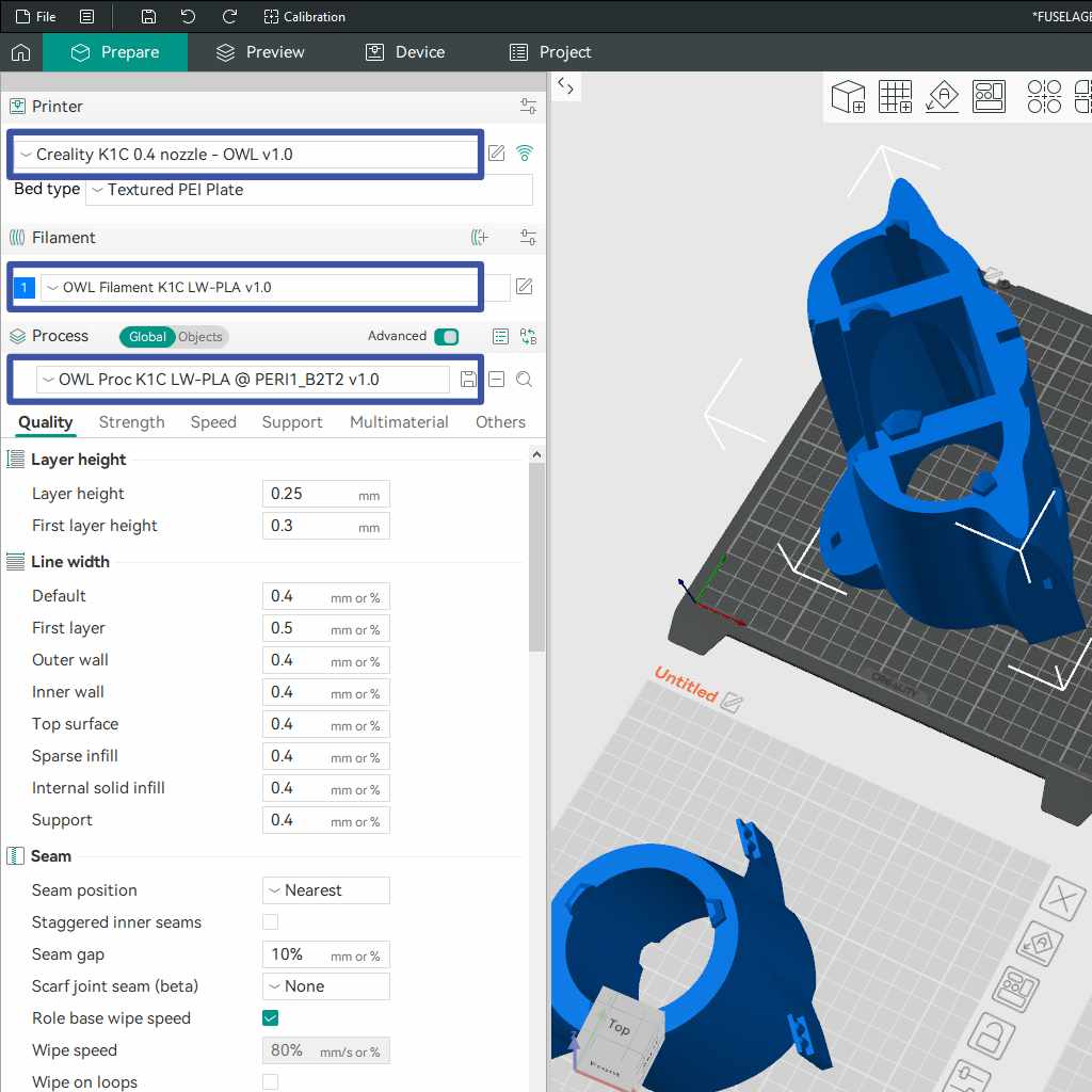 In 2025 and onward, when we release a new model, it should be sliced using OrcaSlicer. If you would like to know more and download the provided profiles, please visit the following page : https://owlplane.com/orca-slicer-for-bambulab-and-others/ or click the button below.
