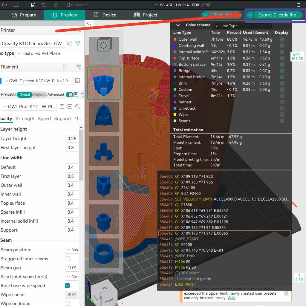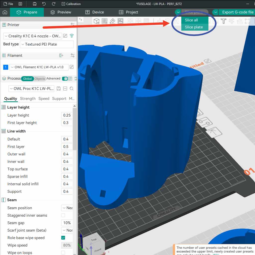 Where the profile code is PERI1_B2T2, it means that needs to find the PERI1_B2T2 process profile code. Once completed, verify that all machine, filament and process are correctly selected (instead of for BambuLab A1, now is for Creality K1C with same LW-PLA filament and process ref. code PER1_B2T2).