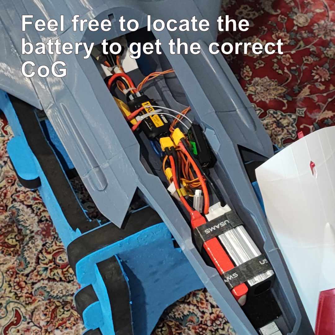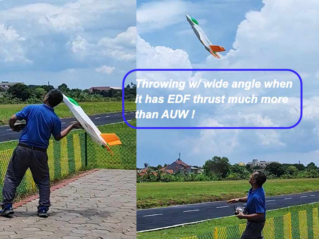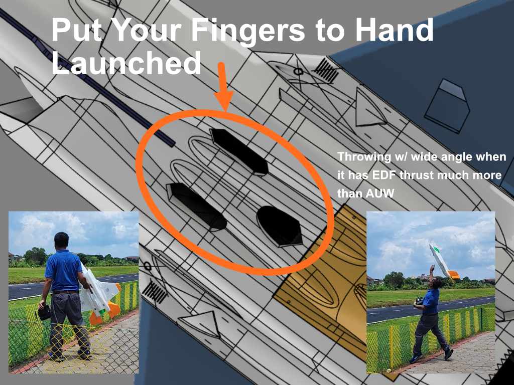 You may want to use 4s 1500mAh so that it would be easy to land and printed with LW-PLA Digital Balsa approach (no-infill). If you are not familiar hand launching an EDF jet, we would suggest you use our Catapult Launcher (it is human free error from throwing the model). During maiden, also suggest using that launcher to get you familiar first with the model. When you have trimmed aileron and elevator control surfaces already, you will have no worry and no need anymore setting the control surfaces at the same time.