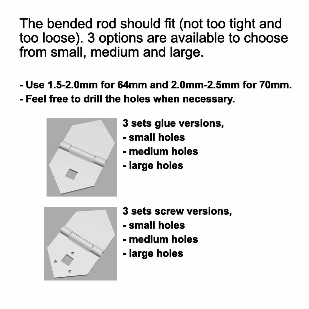 For the hinges, we provide three different hole sizes so that it would be best fit (not too tight and not too loose). They are named as S, M and L for Small, Medium and Large.