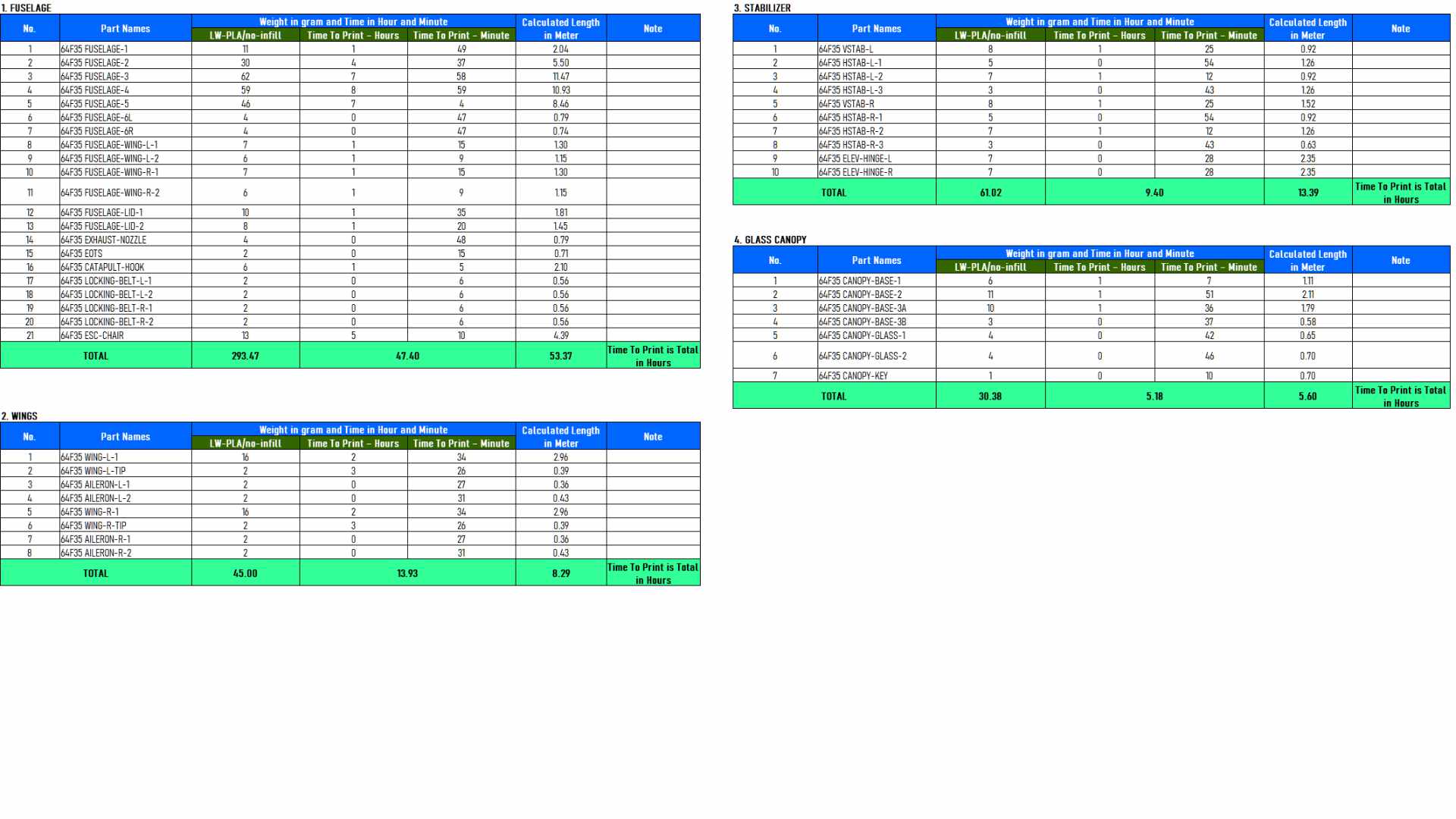 Following tables show the weight of printed parts, number of required filament rolls and time required to print. But the number may vary from printer to printer due to: