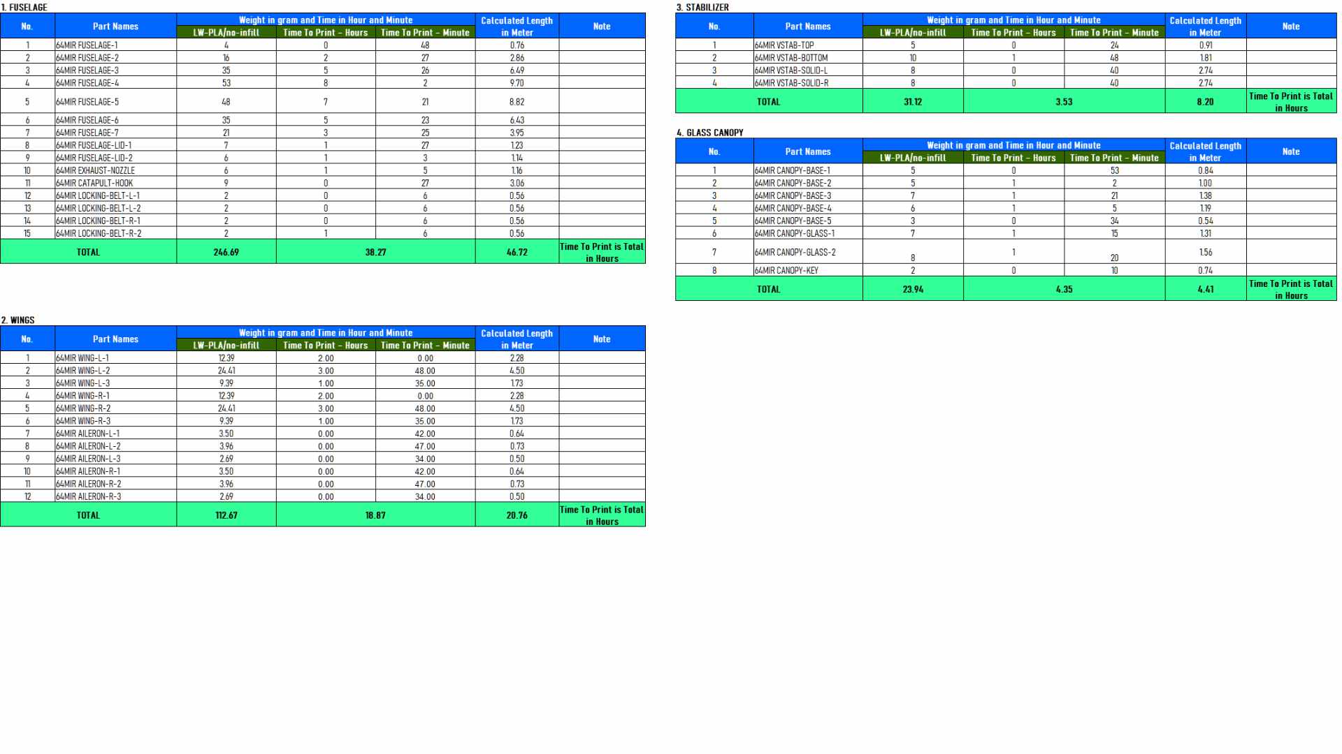 Following tables show the weight of printed parts, number of required filament rolls and time required to print. But the number may vary from printer to printer due to: