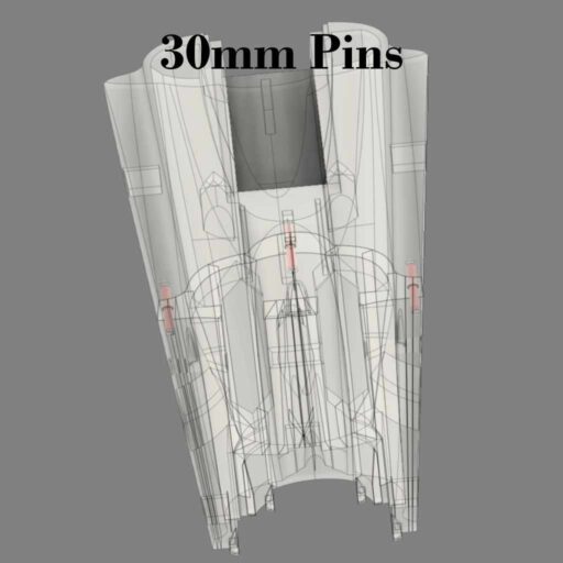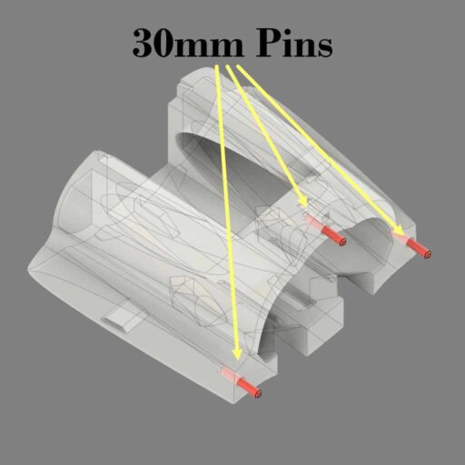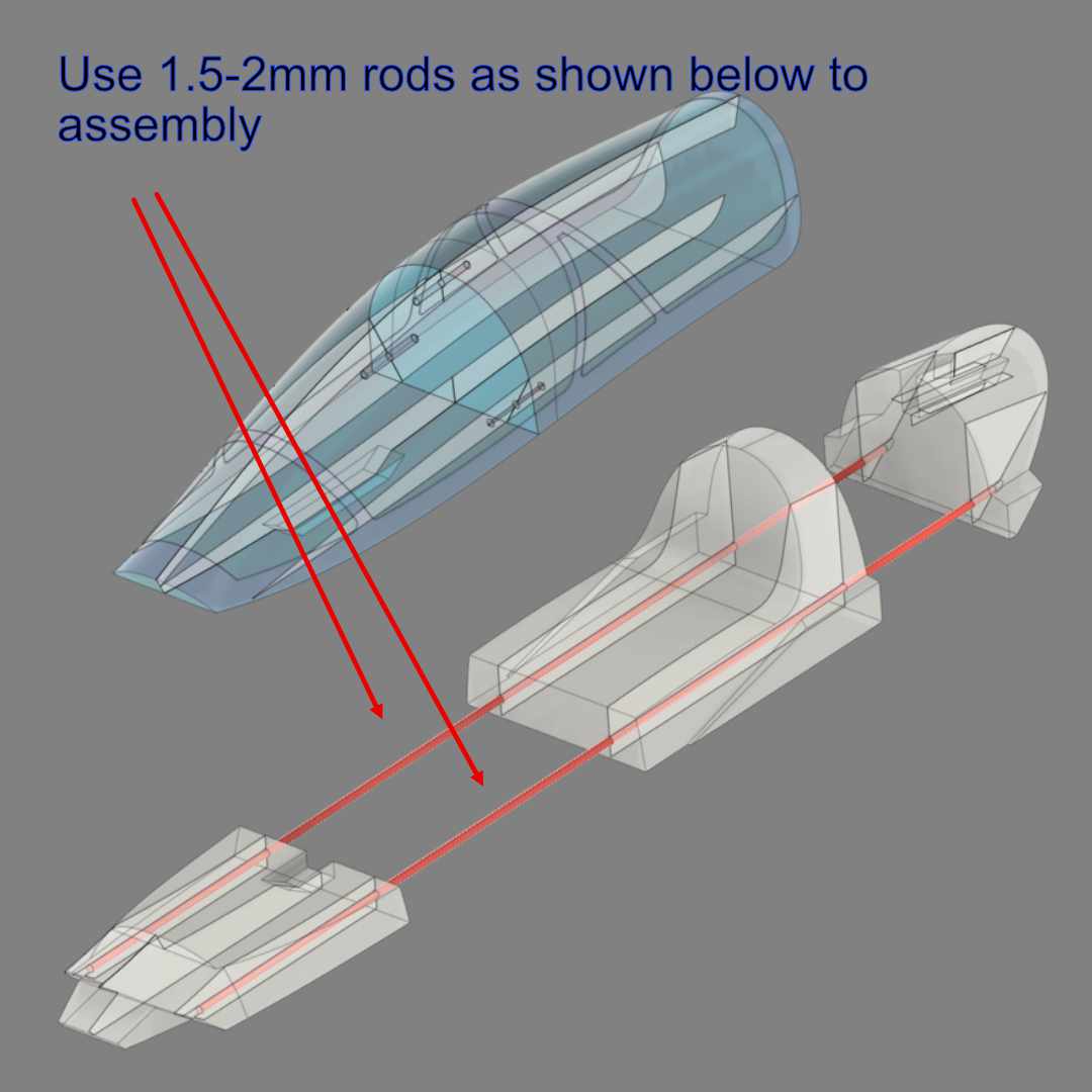 To glue FUSELAGE-4 and FUSELAGE-5, need to use 3 x 30mm pins as shown below. The pin STL files can be found under : “1. STLs M2000D 64mm\SUPPORT v1.0\PINS – please use 30mm PIN”
